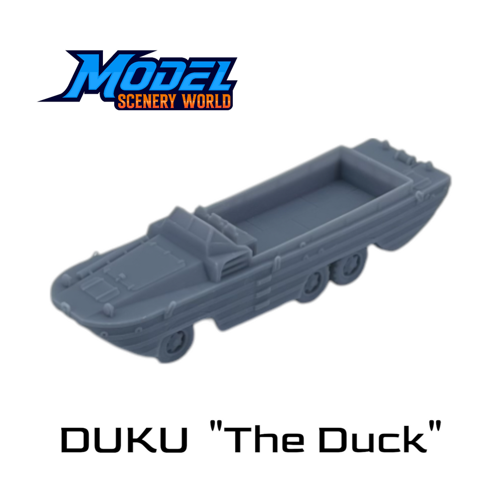 The scale DUKU "The Duck" model captures the iconic amphibious vehicle used by the U.S. military during World War II and the Korean War. Known for its all-terrain and water-crossing capabilities, this detailed gray model reflects the original DUKW’s utility in transporting troops and supplies across challenging environments. Perfect for railcar loads, military dioramas or historical model collections, these replicas offer precise scale accuracy and authentic design features.