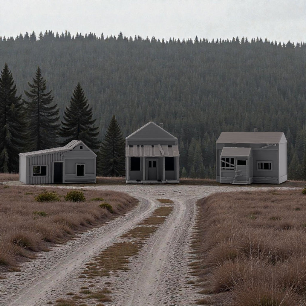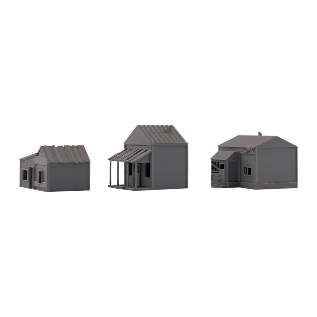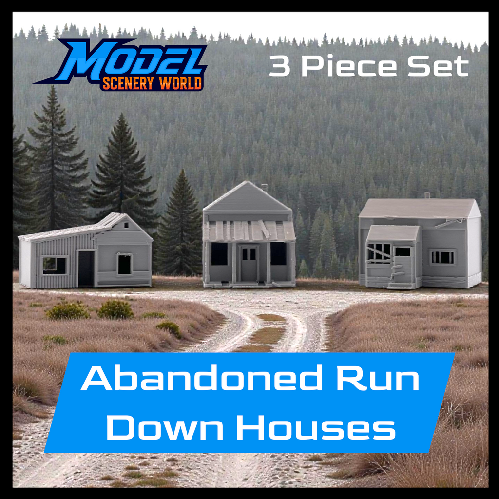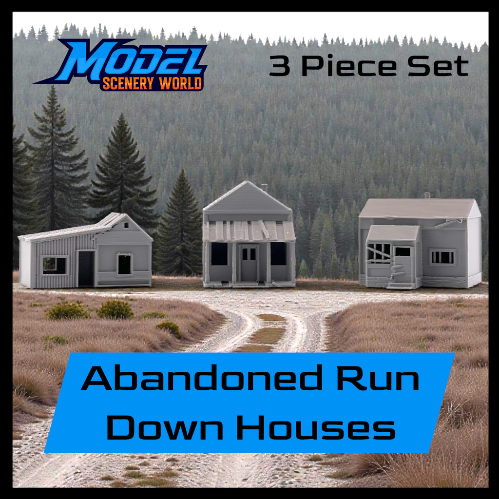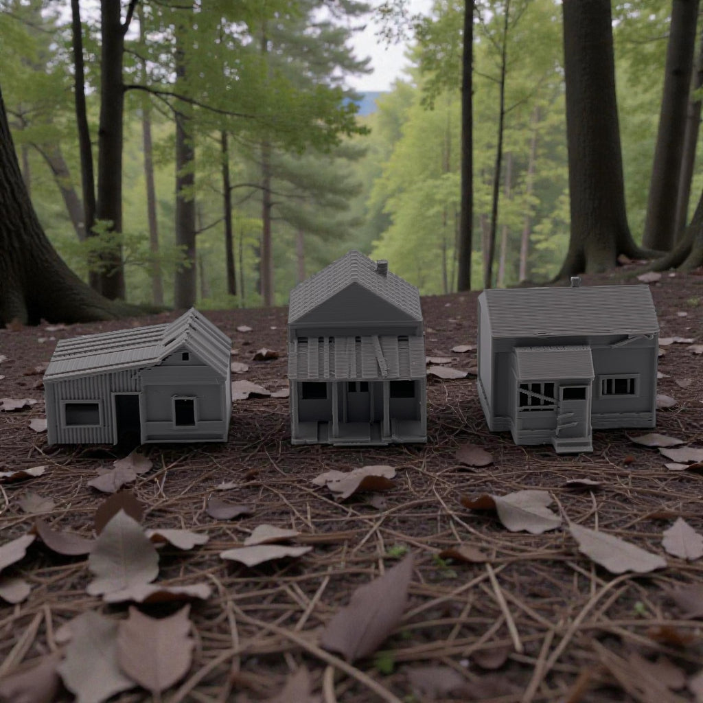 Add atmosphere and storytelling to your layout with this set of three Small Abandoned Houses. Designed to capture the look of run-down, long-forgotten structures, these buildings are perfect for depicting neglected neighborhoods, rural backroads, or areas left behind by time. They can also be used as weathered trackside shanties—ideal for representing forgotten worker housing, maintenance sheds, or long-abandoned structures along quiet rail lines.