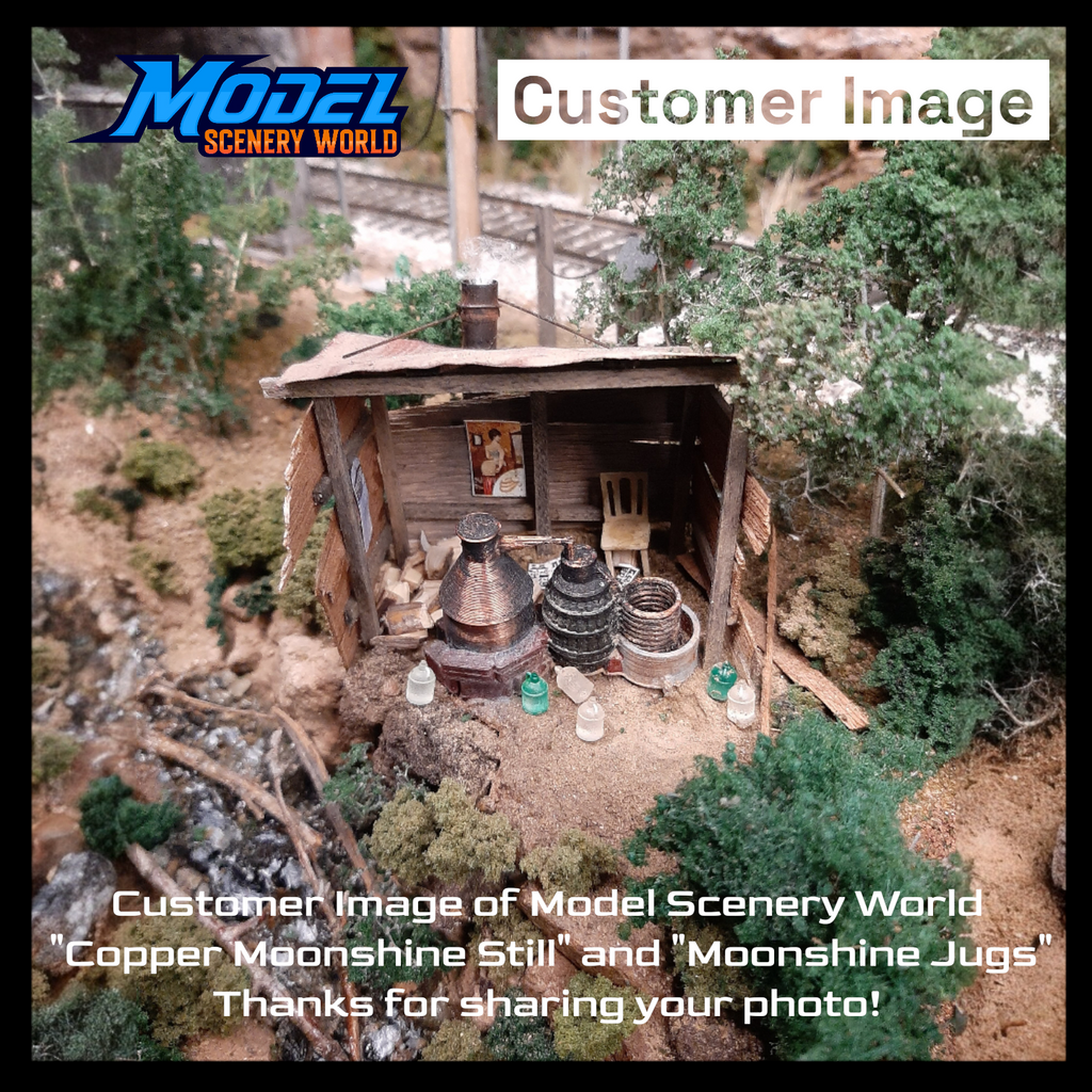Somewhere deep in the woods—not too far from the tracks—a couple of resourceful locals have set up a moonshine still to keep the community happy… and business quiet. What story will it tell on your layout?