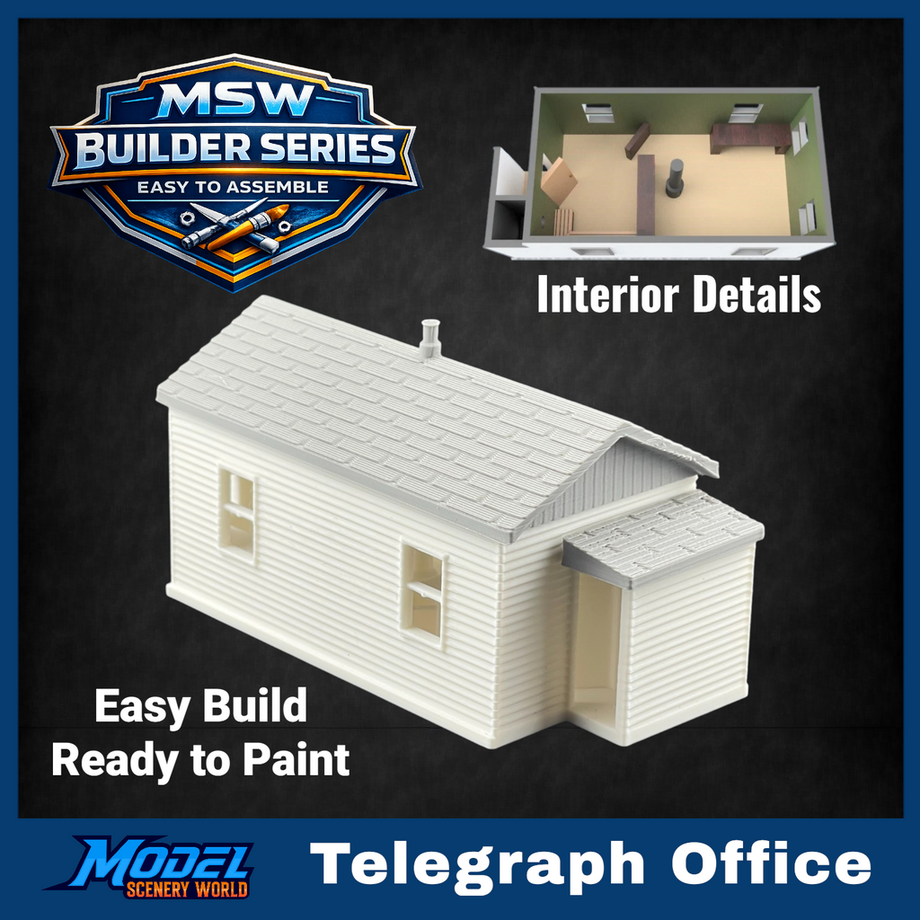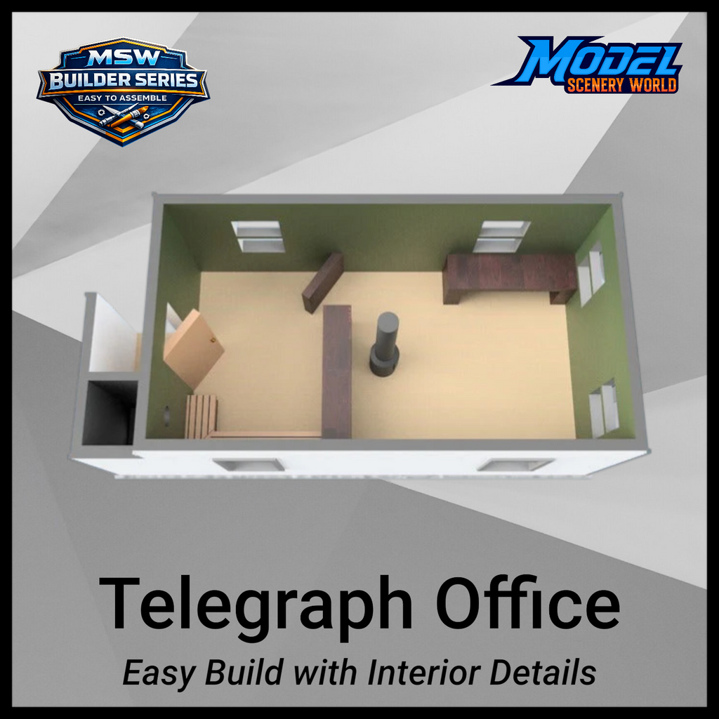 The model features exceptional interior and exterior detail. Inside, you’ll find a fully outfitted space including a telegrapher’s desk, waiting area, doors, counter, bench, and stove. The exterior is finished with realistic wood siding that captures the character of these historic railroad structures.